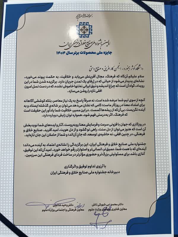 افتخارآفرینی دانشجویان دانشگاه کوثر با مقام برگزیده و جایزه ملی محصولات برتر در اولین جشنواره ملی صنایع خلاق ایران